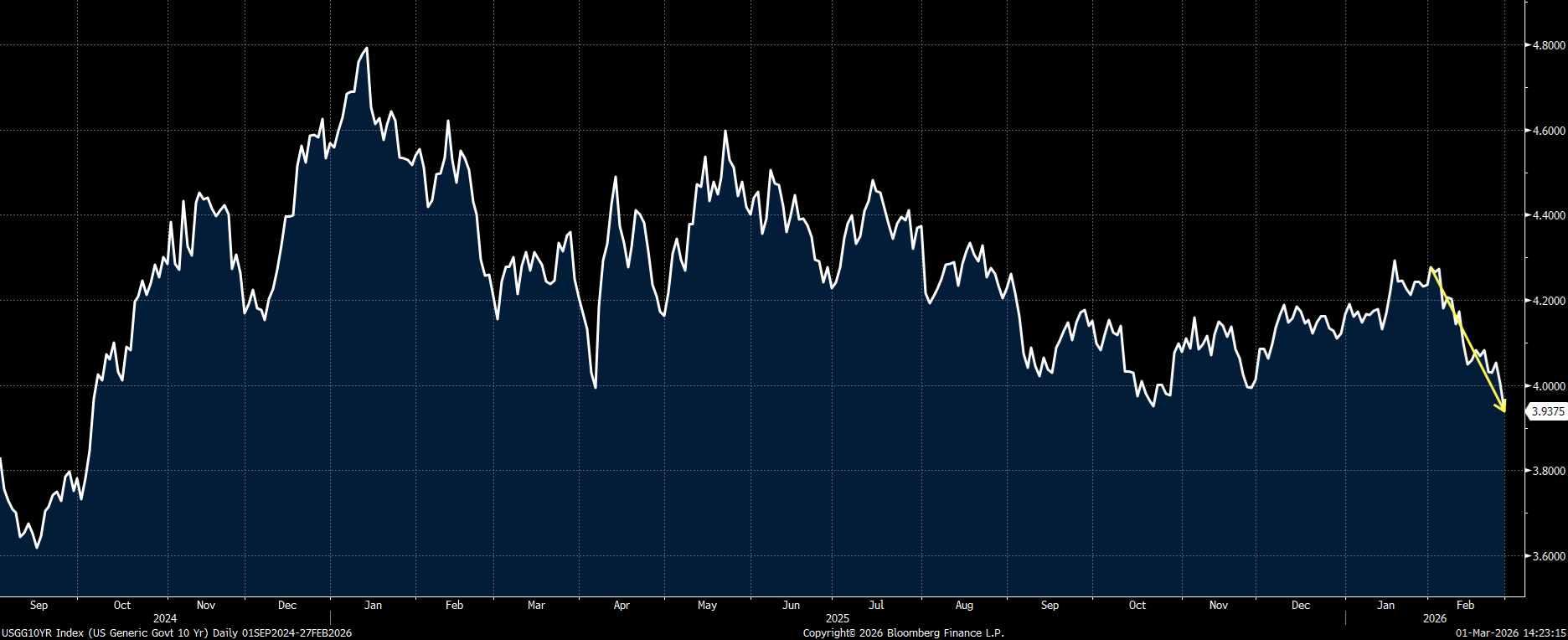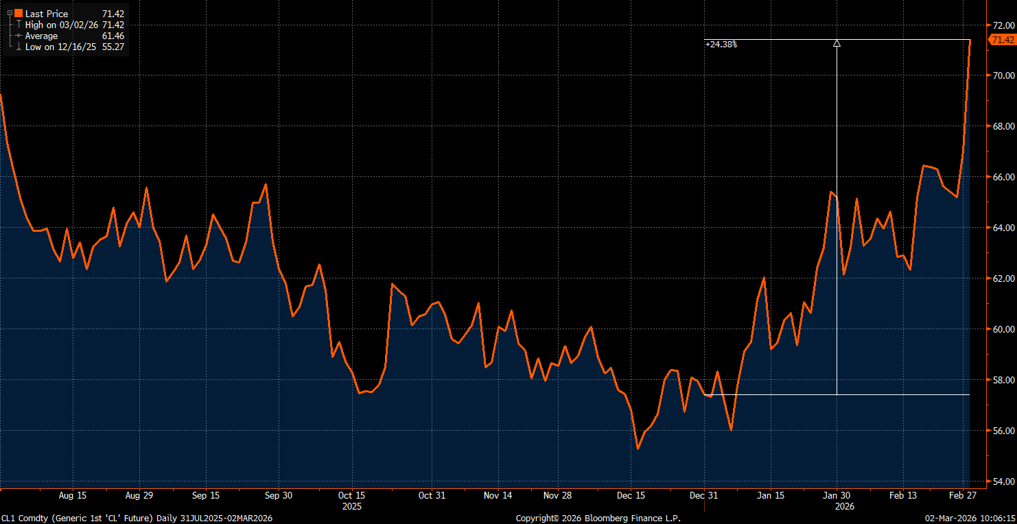 We are writing this in real time, but based on futures markets and today’s opening, market participants are tilting risk off but taking the start of hostilities in stride. As of one hour into trading today, the S&P 500 is down less than half a percent. WTI oil futures were up close to 10% last night, but are up about 6% right now, and that’s where we would expect the initial reaction to be strongest. Gold futures are catching a bid, up more than 1%. The 10-year Treasury yield moved back above 4% as inflation risk, which would push rates higher, offset risk-off demand, which would push rates lower. The move in oil prices is a concern, but WTI futures still sit in the low $70s per barrel, a level that is not a meaningful economic threat yet.