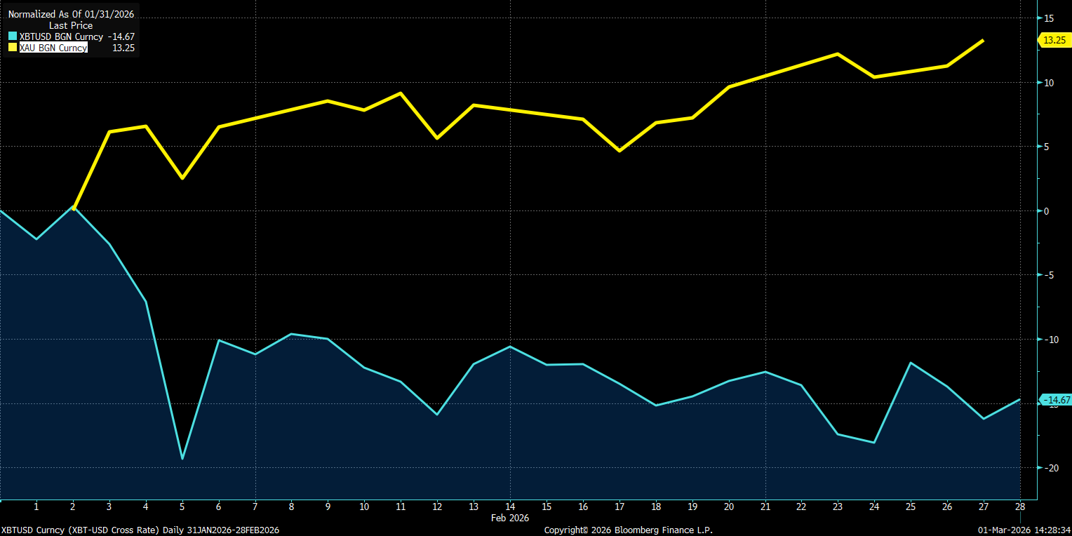 Add in that bitcoin, a risk proxy, fell almost 15% in February (blue line in the chart below), taking its year-to-date loss to -24.4%. Meanwhile, gold, a crisis hedge, rose 13%, taking its year-to-date gain to +21.9%.