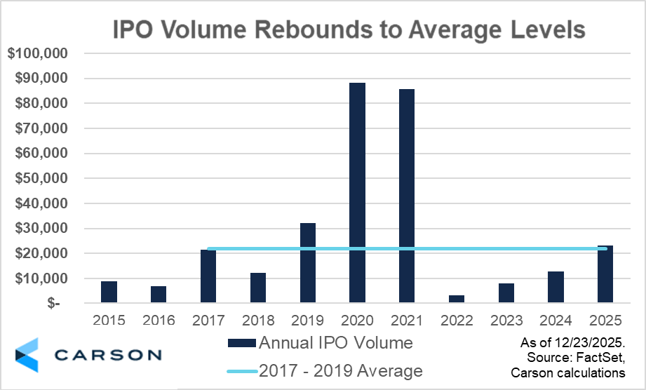 The Initial Public Offering (“IPO”) window reopened in 2025. IPOs are seen as the lifeblood of public capital markets and a measure of risk sentiment, with IPOs often the largest funding round in a company’s life, enabling the companies to vastly expand their investor base. IPO volume largely returned to average levels in 2025, and post-deal returns broke records which speaks to the underlying investor appetite for new issues. 2025 has set the stage for a potential robust 2026 IPO schedule.