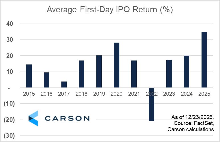 After bottoming in 2022 at $3.2 billion, IPO volumes have grown each year as the bull market in major indices has continued and investor risk appetite has grown. 2025’s total volume is nearly double that of 2024’s $12.8 billion level. While volumes have grown to return to just ‘average’ levels, the first-day returns of IPOs in 2025 have broken records.