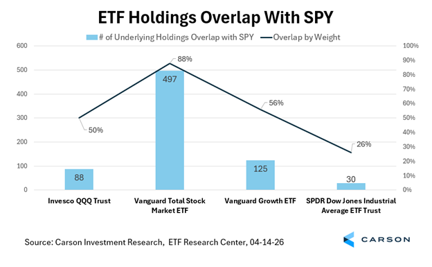 If you were to choose to purchase an additional ETF for varying exposure in addition to your holding in SPY, there is a possibility that your money could be directed in the same way between both funds if you selected one with overlap. Looking at the chart above, if you were looking to add a holding that tracked the Nasdaq and did so via QQQ, you would have 88 holdings that overlap between SPY and QQQ, with 50% overlapping by weight between the funds. When comparing a new prospective purchase to your current ETF holding, overlapping weight is a critical metric and one that should be treated with more consideration over the raw number of shared holdings. High-weighted overlap adds unnecessary complexity and results in unintentional overallocation in holdings you technically already possess.