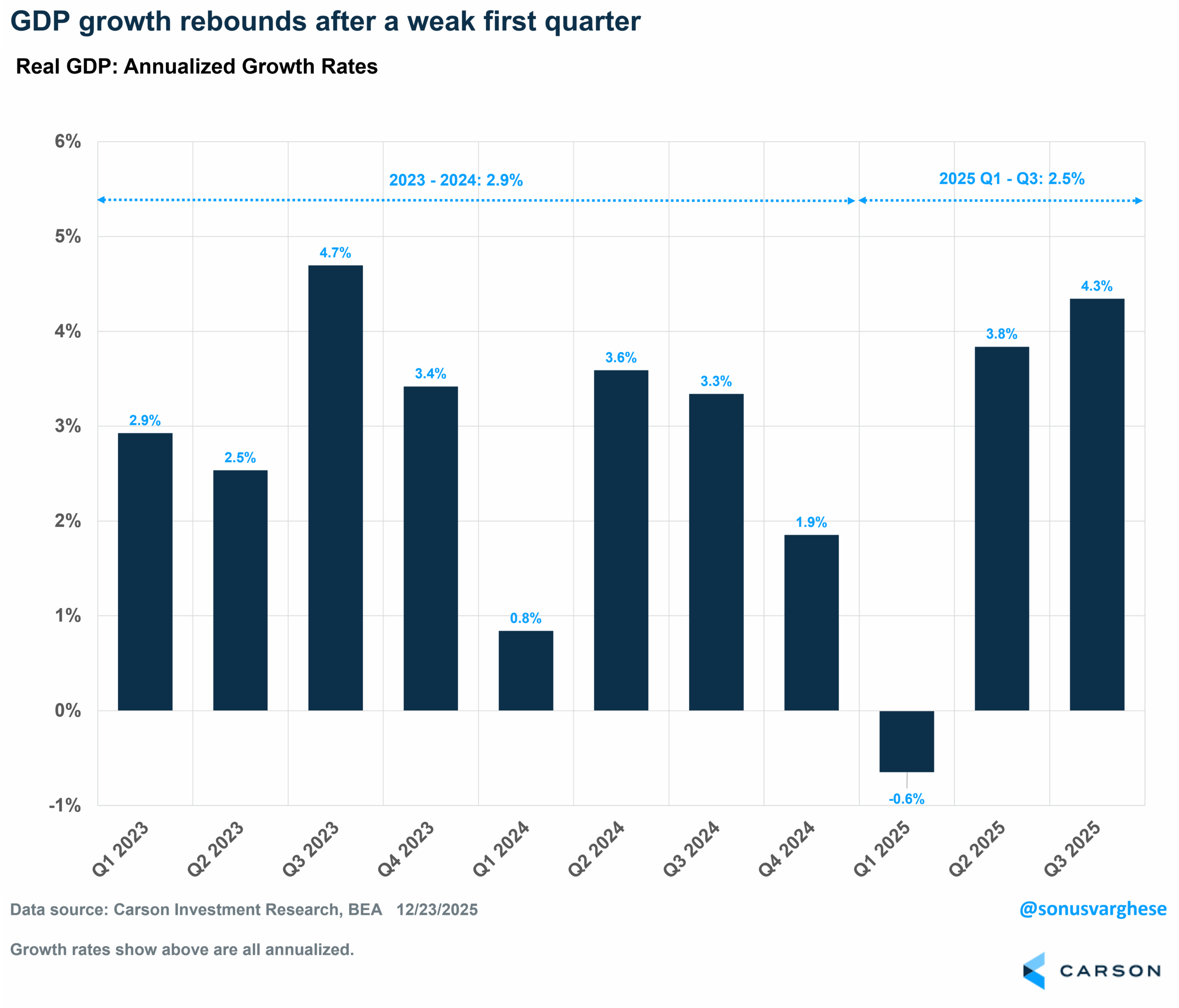 I’ll start with the headline: real GDP growth (so after adjusting for inflation) surged at an annualized pace of 4.3% in Q3, accelerating from an already strong 3.8% pace in Q2. The last two quarters have now made up for the big slowdown in Q1 and the annualized pace of growth over the first three quarters is 2.5%. That’s not as strong as the 2.9% pace we saw in 2023–2024, but is similar to the 2.4% trend growth we saw from 2010–2019.