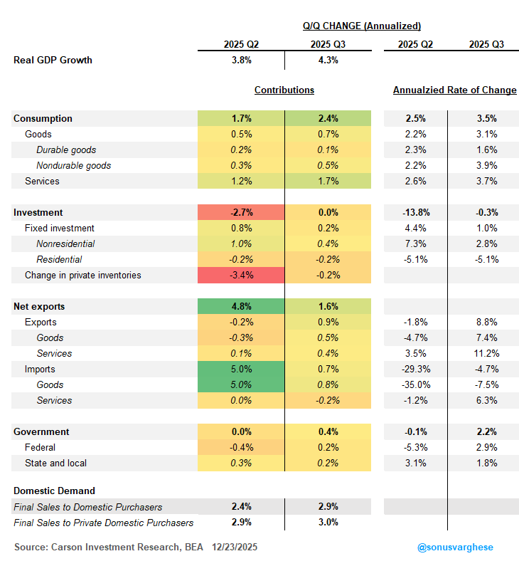 Normally by the end of the quarter we get the second estimate for the prior quarter’s GDP growth (which is slightly more reliable than the first estimate). In the case of this Q3 GDP report, we missed the first estimate because of the shutdown and so the second estimate was the first full picture we got of what the economy looked like in Q3. Yes, it is lagged data at this point, but the details are certainly interesting and it points to solid momentum for Q4 and even 2026. The big picture is that the economy ran strong in Q3 and even most of the details looked pretty good. But let’s dig in.