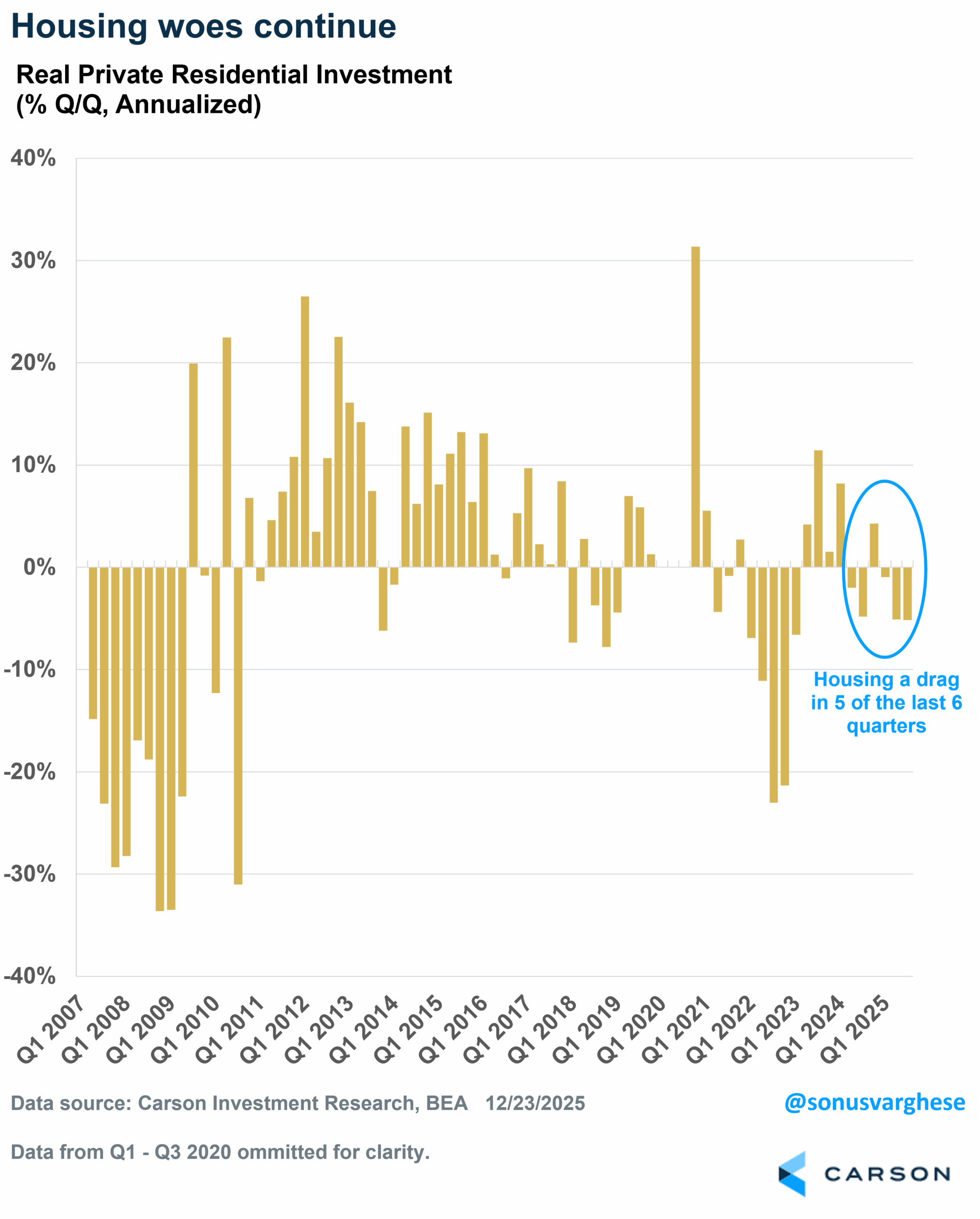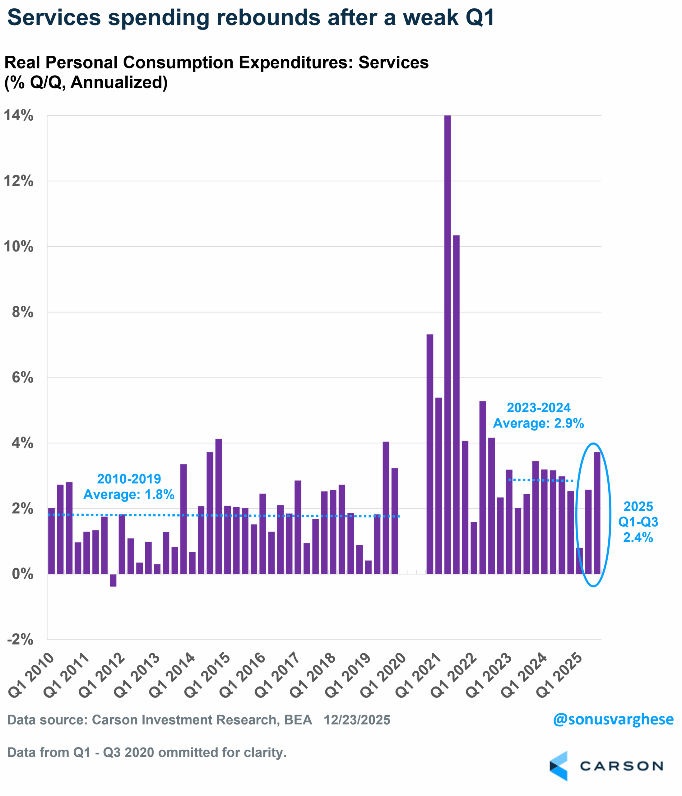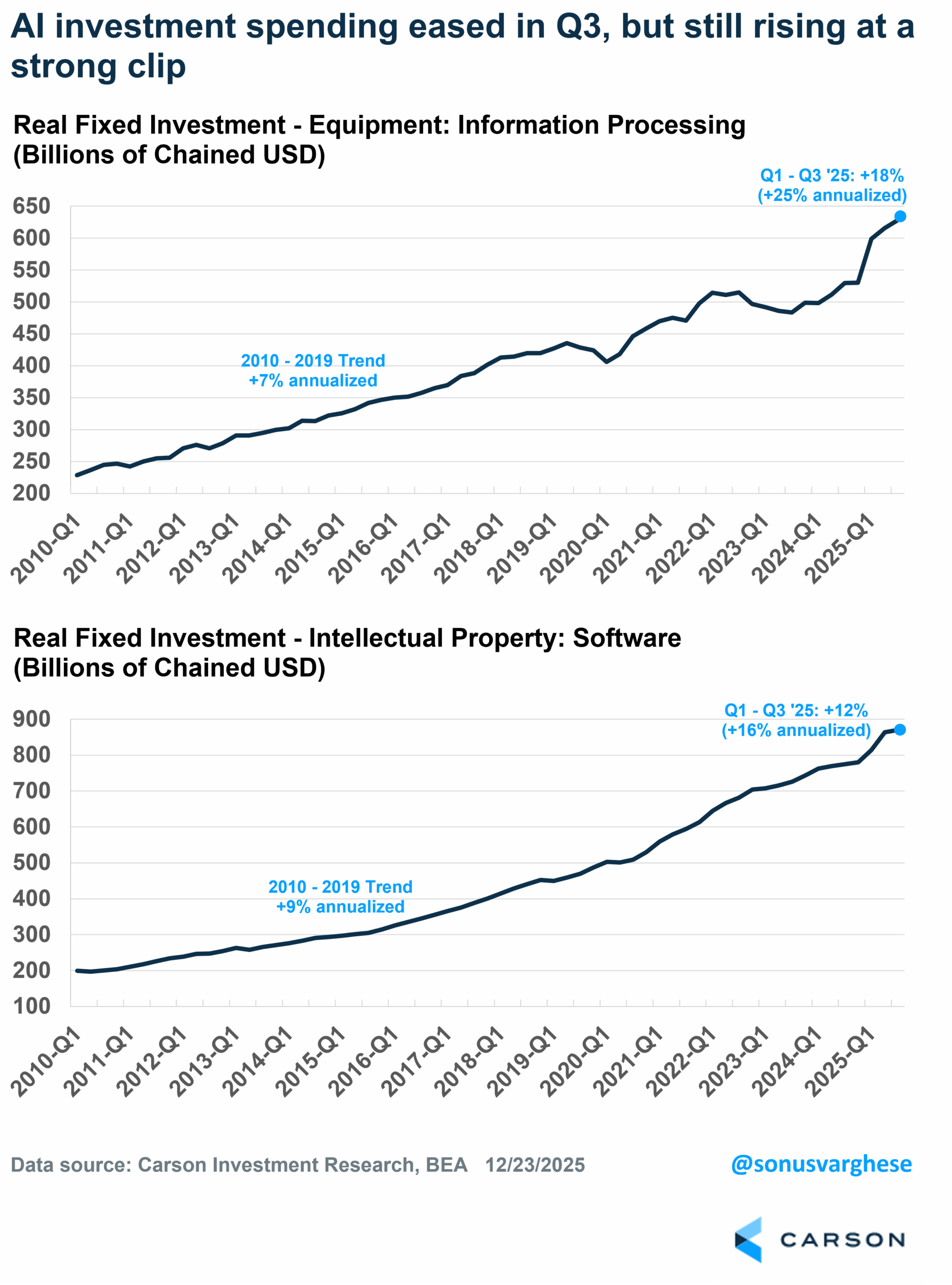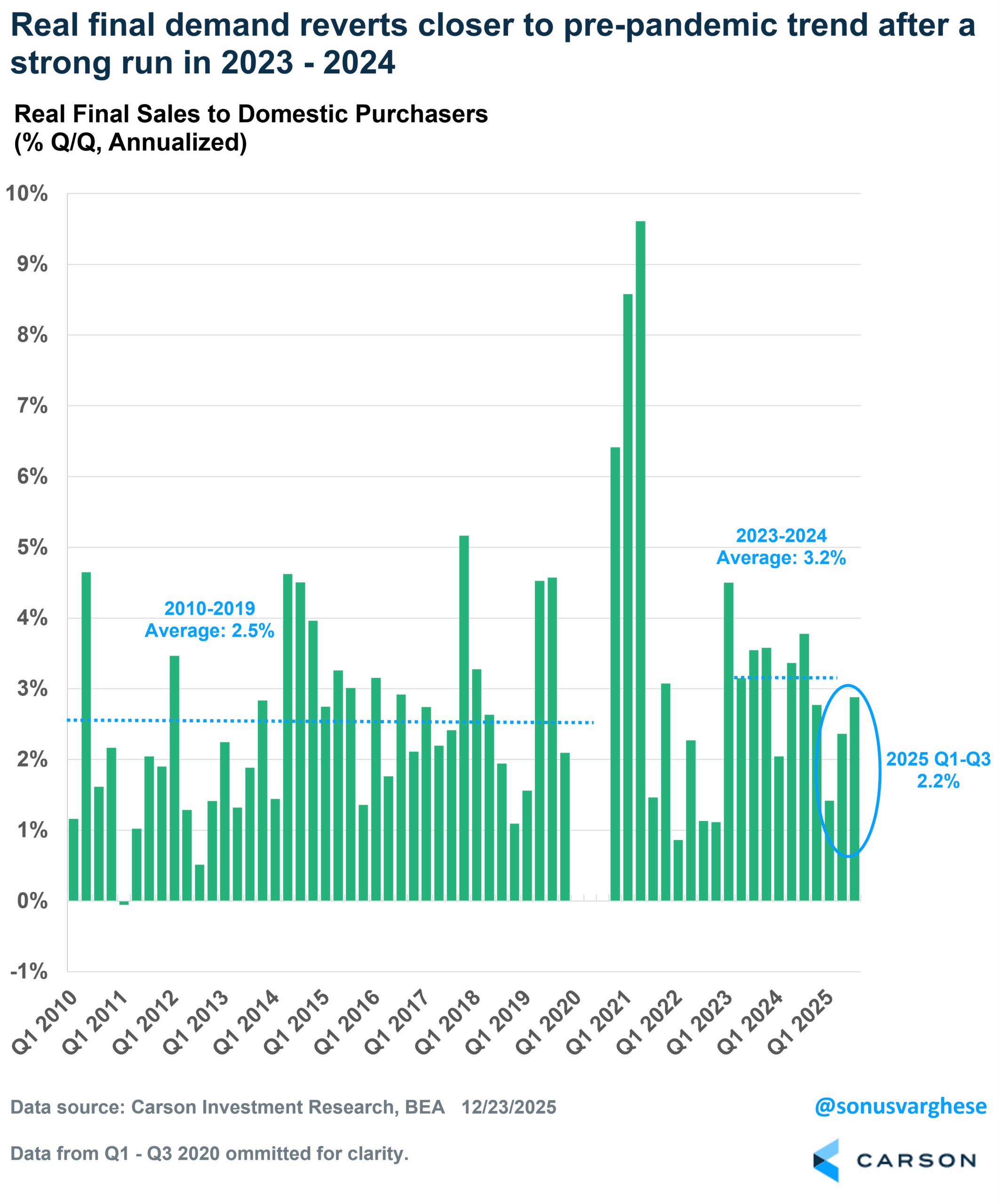 The good news is that we came into Q4 with some momentum, and that could continue into 2026. In fact, private final sales (excluding government) has run at a near 3% annualized pace over the last two quarters. The Q3 data was even better than Q2 because consumption picked up, adding to the boost from AI-related investment spending and more than overcoming the drag from housing.