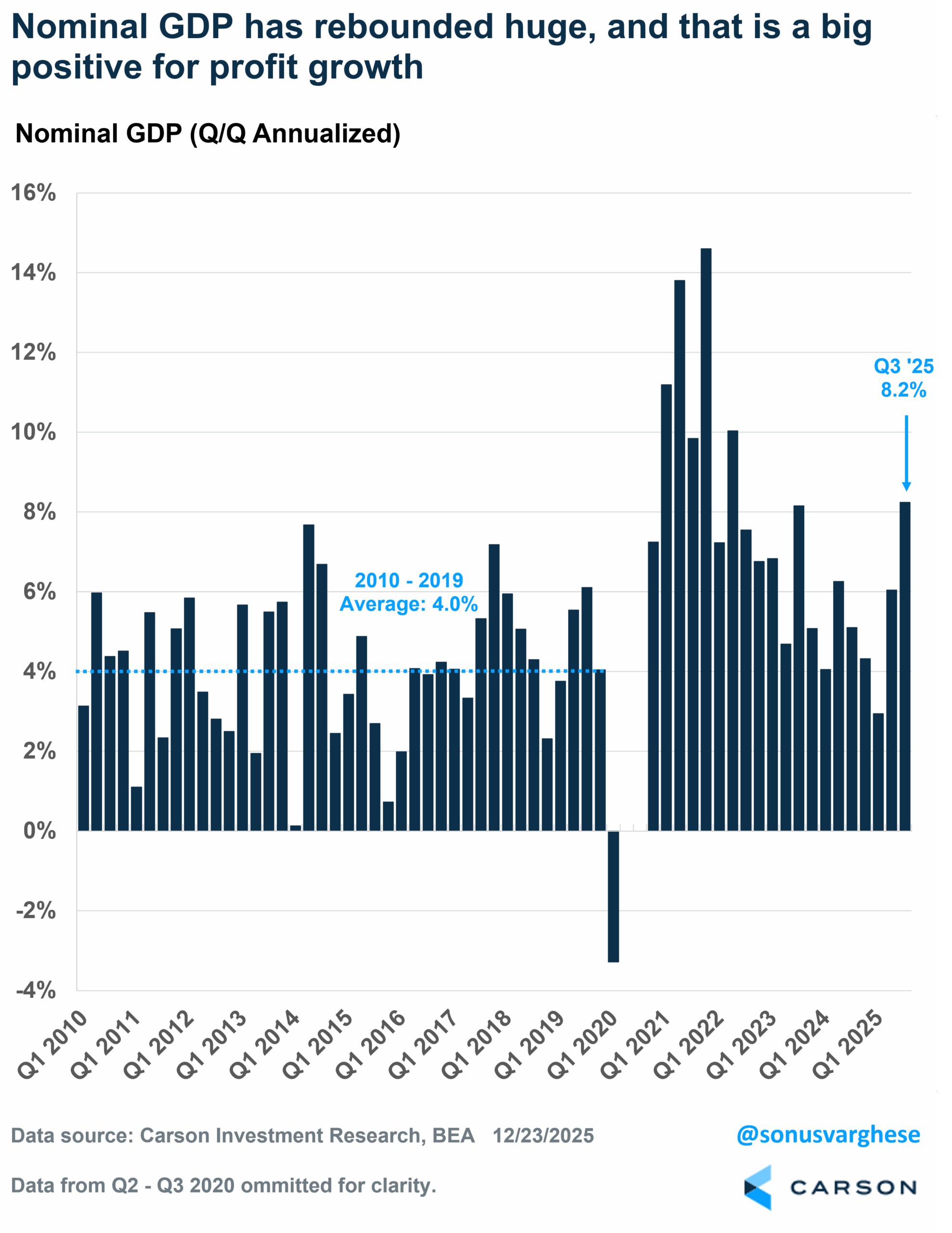 All the numbers I’ve discussed so far are adjusted for inflation. However, from the perspective of company revenues and profit growth, which is what is important for stocks, it’s nominal GDP growth that matters (GDP growth including inflation). Nominal GDP grew at an astounding 8.2% annualized pace in Q3, which follows an already hot 6% pace in Q2. The economy has grown at an annualized pace of 5.6% so far in 2025, which matches the annual pace we saw in 2023–2024 and is well above the 4% trend from 2010–2019.