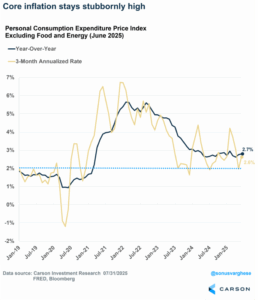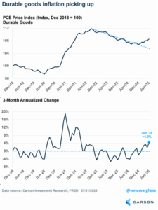 Also, while overall core Personal Consumption Index (“PCE”) inflation (the Fed’s preferred measure) remains steady, it’s still at a level still too high for comfort. We are also clearly starting to see some of the effects of tariffs underneath the hood. What many are missing is that there are also some disinflationary effects in play too, especially around shelter inflation, that have helped offset some tariff effects and will likely continue to help. But tariff effects are just starting to come into play and one important temporary factor that has held back inflation (financial services inflation, which reflects stock prices at a lag) will likely start to unwind. It’s also worth highlighting again that direct tariff effects cause a one-time change to price levels, even if that takes some time to flow through, but do not raise the long-term inflation rate, although added trade friction and any structural shift in inflation expectations can.
