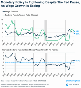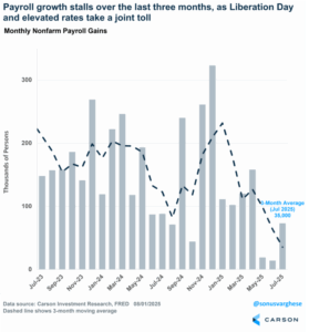 We would actually say the overall risk from tariffs has moderated since Liberation Day simply because we have greater clarity and once companies have clarity they can work with it. (See Carson VP Global Macro Strategist Sonu Varghese’s “The Trade War Is Over. Thank You for Your Attention to This Matter.” for a deeper dive.) That’s directional improvement, and companies will probably be able to game the environment to a degree so that actual tariffs paid ends up being somewhat lower than expected. (Businesses are much better at finding loopholes than governments are at closing them.)