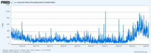 Note that policy uncertainty is not always a negative for markets because markets tend to be forward looking and uncertainty (fear) can be overpriced. High or peak uncertainty can often occur near market lows—this in fact what we saw just after Liberation Day. We can see the decline in policy uncertainty in the Economic Policy Uncertainty Index shared by the Fed, which has been trending downward since early April, but remains above its longer-term baseline.