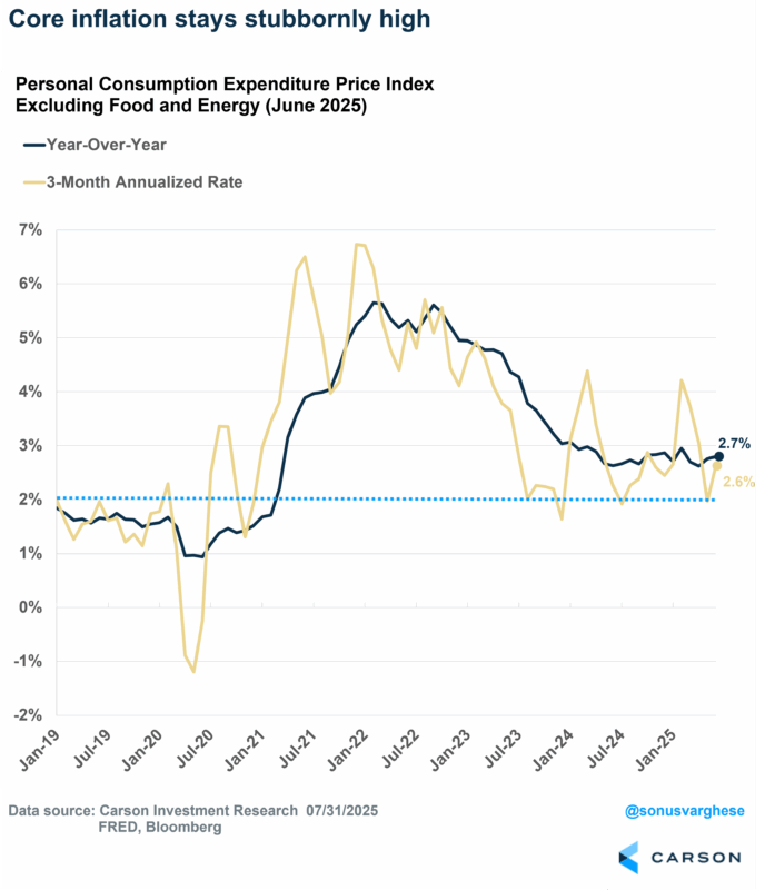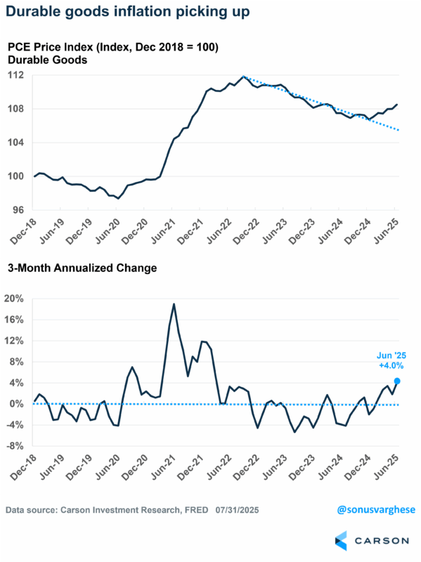 Also, while overall core Personal Consumption Index (“PCE”) inflation (the Fed’s preferred measure) remains steady, it’s still at a level still too high for comfort. We are also clearly starting to see some of the effects of tariffs underneath the hood. What many are missing is that there are also some disinflationary effects in play too, especially around shelter inflation, that have helped offset some tariff effects and will likely continue to help. But tariff effects are just starting to come into play and one important temporary factor that has held back inflation (financial services inflation, which reflects stock prices at a lag) will likely start to unwind. It’s also worth highlighting again that direct tariff effects cause a one-time change to price levels, even if that takes some time to flow through, but do not raise the long-term inflation rate, although added trade friction and any structural shift in inflation expectations can.