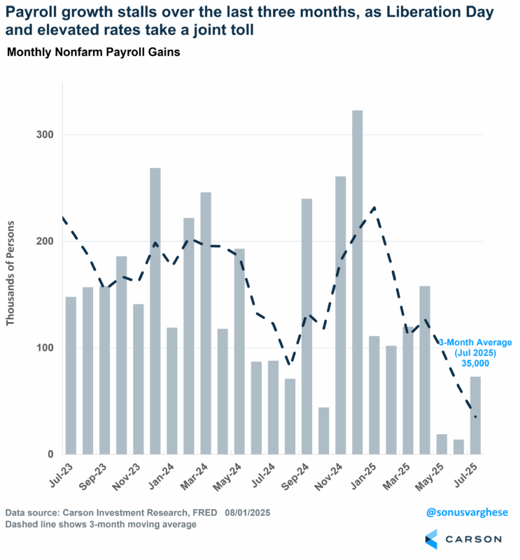 We would actually say the overall risk from tariffs has moderated since Liberation Day simply because we have greater clarity and once companies have clarity they can work with it. (See Carson VP Global Macro Strategist Sonu Varghese’s “The Trade War Is Over. Thank You for Your Attention to This Matter.” for a deeper dive.) That’s directional improvement, and companies will probably be able to game the environment to a degree so that actual tariffs paid ends up being somewhat lower than expected. (Businesses are much better at finding loopholes than governments are at closing them.)