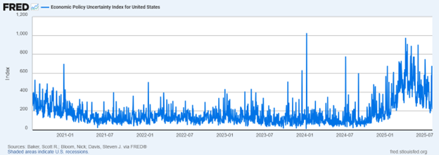 Note that policy uncertainty is not always a negative for markets because markets tend to be forward looking and uncertainty (fear) can be overpriced. High or peak uncertainty can often occur near market lows—this in fact what we saw just after Liberation Day. We can see the decline in policy uncertainty in the Economic Policy Uncertainty Index shared by the Fed, which has been trending downward since early April, but remains above its longer-term baseline.