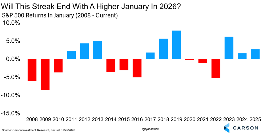 First things first — the S&P 500 has now been alternating in January between three years of gains and three years of losses going back 18 years! Should we get some nice reactions to earnings this week, we could end this streak and have a higher January four years in a row. And as I’ll show next, if you are bullish, you’d like to see a higher January.