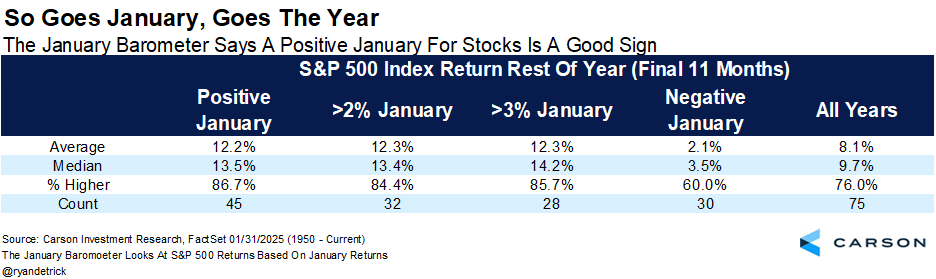 I’ll talk a lot more about this in detail next week (and I don’t want to jinx it), but the January Barometer is an old investment axiom that says, ‘So goes January, so goes the year.’ No, never invest in just one thing like this, but when January is higher, the next 11 months have been higher nearly 87% of the time. That is something I’d like to see happen. 😉