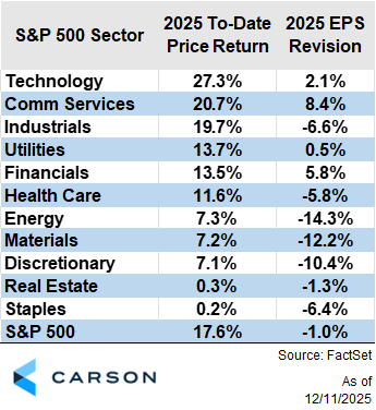 Tech stocks stand out on this measure, with the sector seeing a positive 2.1% revision to its 2025 earnings expectations from the start of the year. Only four of the eleven S&P sectors can claim this strength in 2025, and tech ranks third.