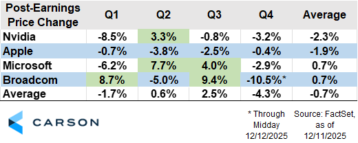 The technology sector is the highest-returning S&P 500 sector so far in 2025. This outperformance has been driven by positive earnings revisions, whereas the broader market has seen negative earnings revisions. Tech’s fundamental outperformance has been driven by the sector’s largest companies, with the four largest all seeing positive 2025 earnings revisions and even more robust 2026 revisions. While tech’s fundamental story was strong this year, that didn’t translate to positive returns on the day following their earnings reports.