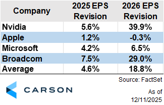 The positive revision in technology’s earnings estimate has been driven by the largest stocks in the sector. As shown below, the four largest stocks have all seen positive earnings revisions since the start of the year. What’s more, investors in technology stocks appear to have become even more bullish on 2026’s prospects, as earnings estimates for next year have drastically outpaced 2025’s revisions. Perhaps this is another reason why tech stocks have been so strong this year as investors look to 2026.