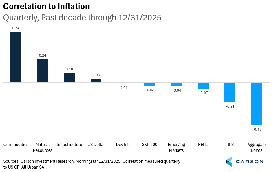 The chart below illustrates this point. Over the past 10 years, commodities, natural resource companies, and infrastructure have been positively correlated to changes in inflation. On the flip side, fixed income suffers when rates rise – and interest rates are generally tied at the hip to inflation and inflationary expectations. Even TIPS, specifically designed to protect principal from inflation, don’t usually help all that much when inflation is around, but they do behave better compared to traditional fixed income.