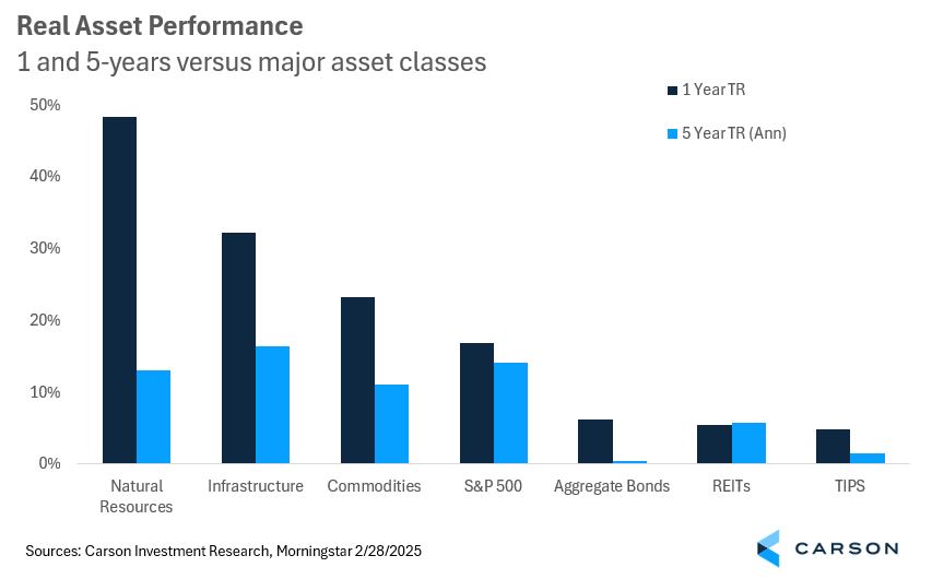 The interest in real assets lately really started back in 2020. If you remember, many of us would like to forget – oil futures actually went negative in April of that year for a brief period. Since that day, energy infrastructure companies (think MLPs, etc) thrown out with the bathwater of negative oil prices have actually doubled the return of the S&P 500! Strength in commodities and natural resources emerged in 2022 as inflation rose precipitously, and in more recent years, it has been gold that has led nearly every asset class. Now in 2026, we are seeing other commodities pick up steam, and most recently, oil prices have jumped globally on the conflict in Iran.