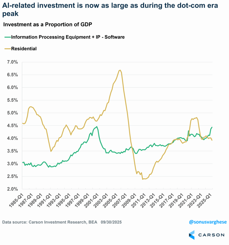 What’s amazing is that AI-related investments contributed the exact same amount as consumer spending in the first half of 2025 (105 bps on average per quarter). Keep in mind that consumer spending makes up 68% of the economy, whereas the AI-related categories account for just 4.4% of GDP. That’s actually as high as it got during the dot-com boom. In the chart below, I also included residential investment for comparison, since that’s a category that has had huge ups and downs over the past decade. Right now, it makes up less than 4% of GDP, well below the peak of near 7% at the height of the housing bubble.