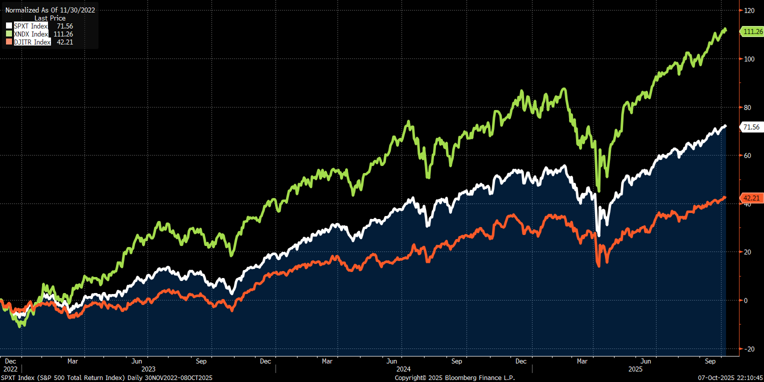 You generally hear about how AI is going to impact businesses, and the economy, in a big way in the near future. It’s already having a massive impact on the stock market. ChatGPT was publicly released on Nov 30, 2022. It was initially a free “research preview” but took off from there. Since then, through October 8th 2025, here are returns for the S&P 500, the tech-heavy Nasdaq, and the Dow Jones (which has “only” a 20% allocation to Technology stocks):