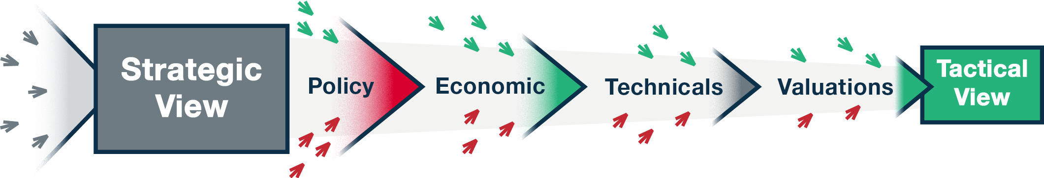 After we develop our strategic views, we overlay elements of the current business cycle to generate our short-term tactical views. Note that these may even run contrary to our longer-term views.