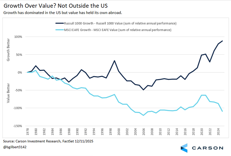 From Michael: “This has been my favorite chart to look at when trying to explain why I believe the AI and technology-related market leadership that dominates the news is a US phenomenon rather than a global trend. This is especially useful when evaluating active manager attribution, as the context for a market’s or index’s performance, and any positive or negative excess performance an active manager generates, is heavily influenced by the differences in holdings. The US economy has increasingly been driven by high-margin, asset-light business models focused on intellectual property, software, platforms, data, and services, which naturally favor growth-oriented sectors. Non-US developed economies tend to be more reliant on capital-intensive, cash-flow-driven businesses in industries such as manufacturing, banking, energy, biopharma, materials, and other export-oriented sectors that align more closely with a value-oriented style. There are numerous dynamics within the labor and capital markets that have led to this divergence in the success of industries across regions. This has made evaluating international manager performance in 2025 much more interesting than evaluating US manager performance. In the US, excess returns over the past 5-10 years have generally boiled down to “were you overweight technology or this small subset of market movers (FAANG, Mag 7, etc.),” whereas international managers have had different and more diversified sources of excess returns to potentially capitalize on, putting a greater emphasis on manager skill.”