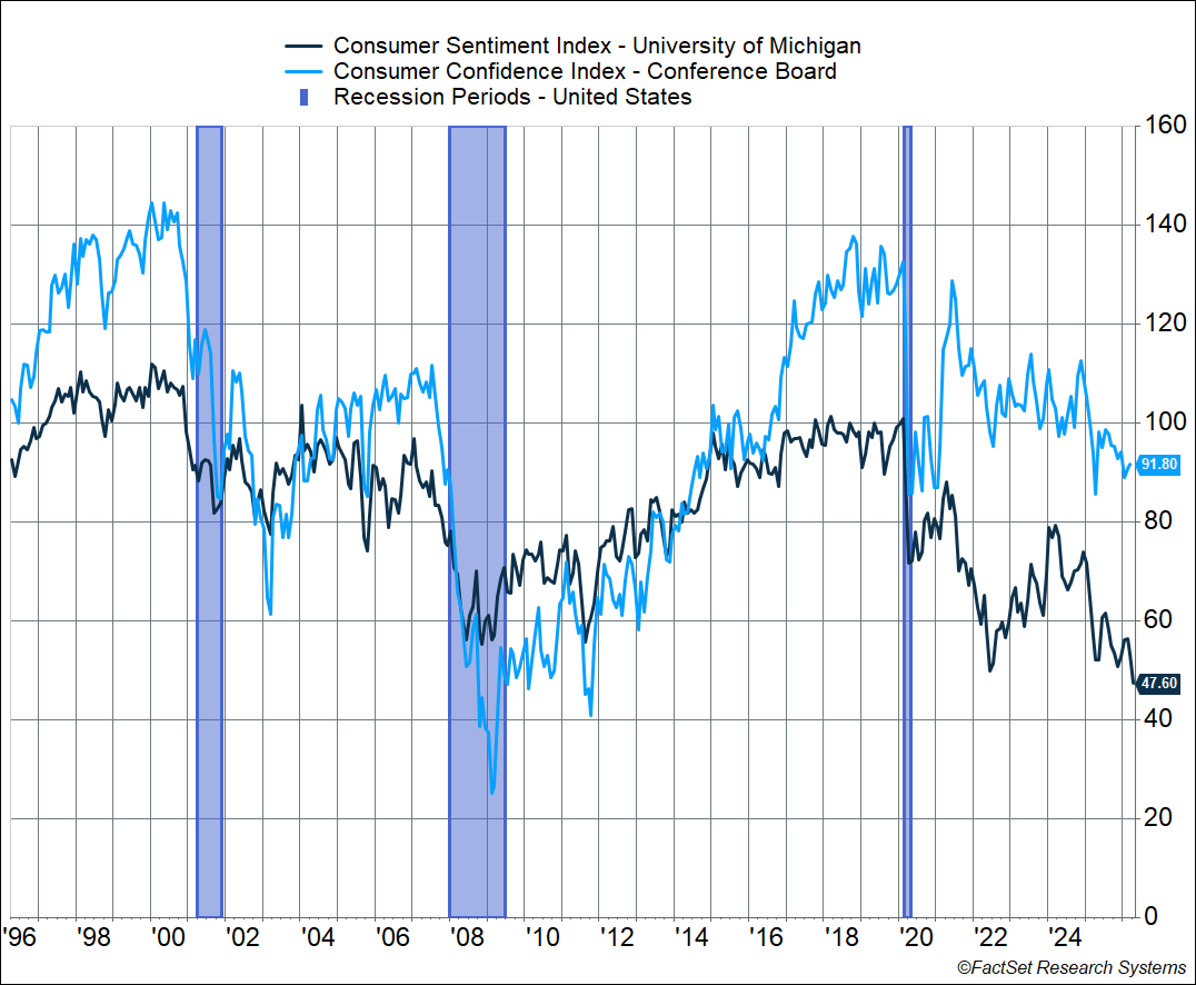 Inflation picked up in 2021 and peaked in mid-2022. Sentiment recovered over the next couple of years but took another leg down in 2025 amid the tariff chaos (more inflationary pressures) and yet another leg lower recently amidst the energy shock from the US/Israel-Iran war.