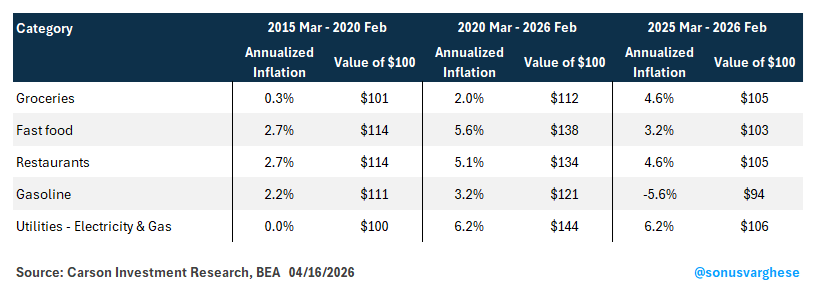What’s important here is that higher inflation is not just about gasoline prices. There’s broad-based inflation across goods and services. I thought it’d be interesting to look at a few major categories and compare inflation rates across three periods: