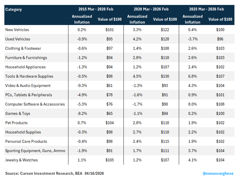 Here’s a look at several goods. Almost all of them saw prices fall pre-pandemic, i.e., deflation. That’s reversed since the pandemic hit, except for a few categories that still saw deflation. But over the past year, every category listed below except for used cars has seen prices pick up by an average of about 3%, thanks to tariffs.