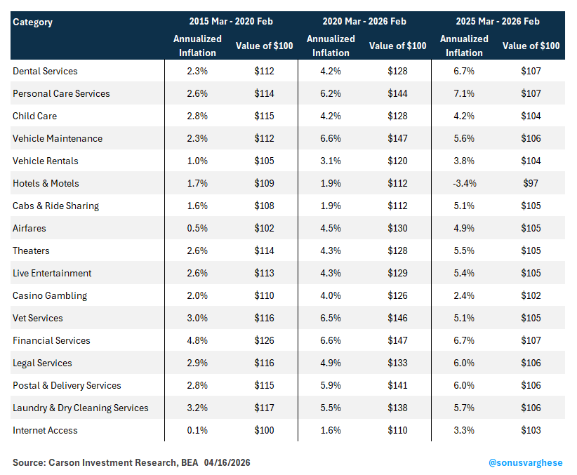 Take something as mundane as laundry and dry-cleaning: $100 worth of laundry and dry-cleaning in early 2015 would’ve been equivalent to $117 pre-pandemic. However, $100 worth in February 2020 would be equivalent to $138 six years later. Just over the past year, inflation for this category has run at 6%!