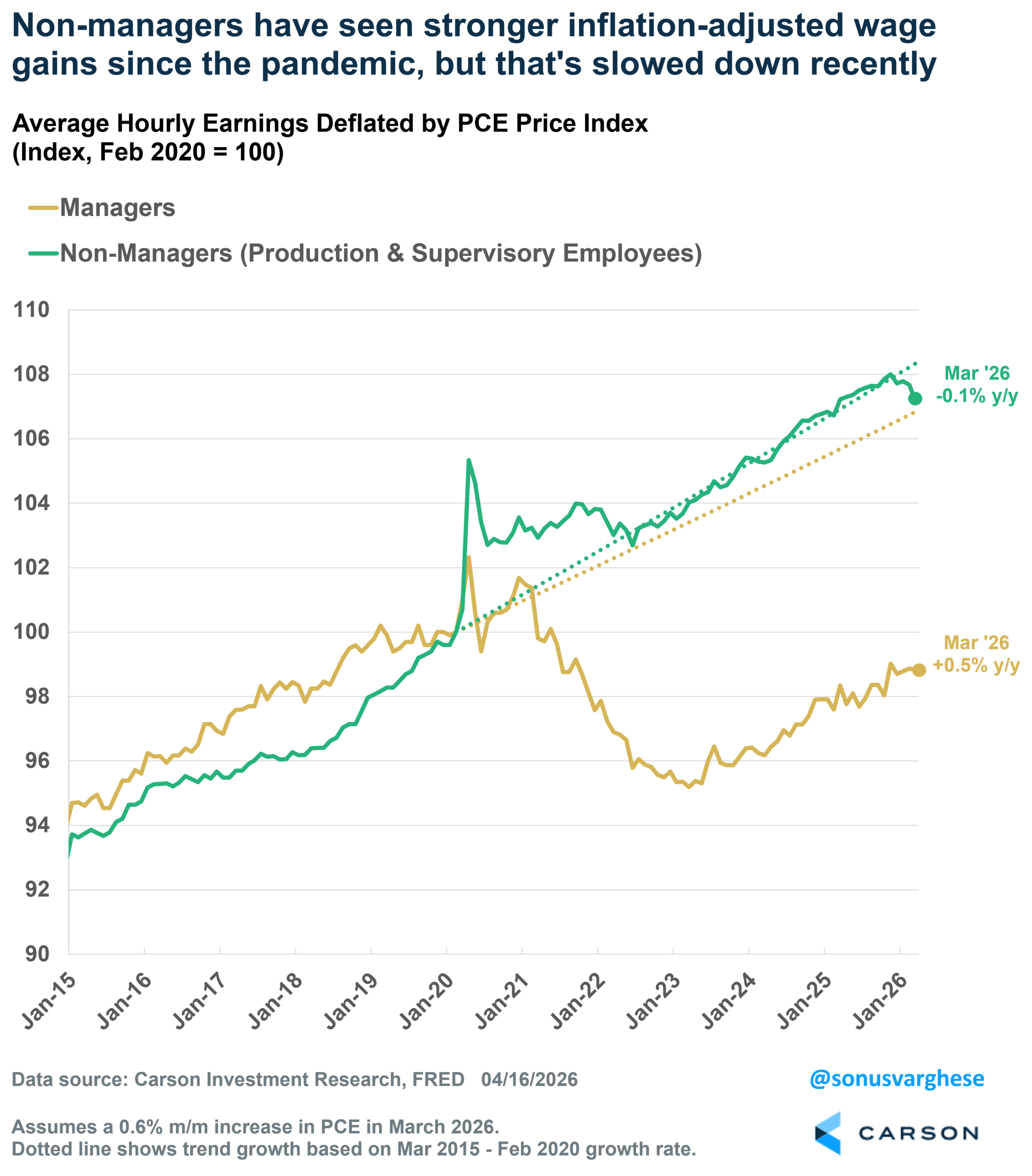 I separated average hourly earnings for managers from non-managers (“production and non-supervisory workers” as the Bureau of Labor Statistics calls them) and then adjusted these for inflation using the personal consumption expenditures (PCE) inflation index. I used PCE because it’s a broader measure of inflation than CPI. CPI has a third of the basket allocated to rents versus 16% in the PCE basket. Keep in mind that 2/3rds of American households own homes, and most of them own one with a very low mortgage rate that was purchased pre-2022 – rents matter, but perhaps not to the extent captured in CPI.