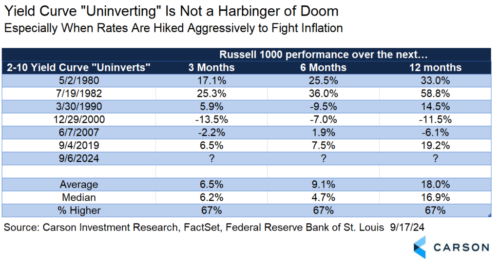 Much was made of the yield curve inverting back in July of 2022. But the bear market bottomed three months later and the expansion continued. In fact, real GDP grew at an annualized pace of 2.8% over the two years since July 2022, above the 2010-2019 average of 2.4% and the S&P 500 rose over 40% from July 31, 2022 to August 31, 2024. Much was made of the inversion reaching more than 1% for the first time since 1981 in June of 2023. Markets pressed higher and the expansion continued. By our measure the yield curve uninverted (assuming it stays that way) on Friday, September 6, 2024. (It had uninverted a little earlier but had inverted again.) What happens next?