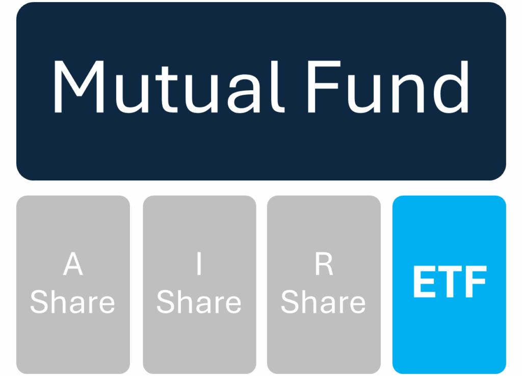 The concept is straightforward: an ETF can function as another share class of an existing mutual fund. All share classes draw from the same pool of managed assets, but each comes with different fees and use cases. Each share class trades under a different ticker, though the underlying holdings are identical because they all roll up to the same fund. Inflows and outflows in the traditional mutual fund structure are managed in cash: portfolio managers invest new cash or sell securities (or use existing cash) to fund redemptions, which can trigger capital gains that must be passed along to shareholders.