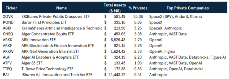 Sources: Carson Investment Research, Morningstar Direct, ETF Daily holdings files as of 4/14/2026. Private % and companies are subject to change at any point. Larger private exposures absolutely do not imply a more or less attractive investment. Consider all risks and objectives before investing.