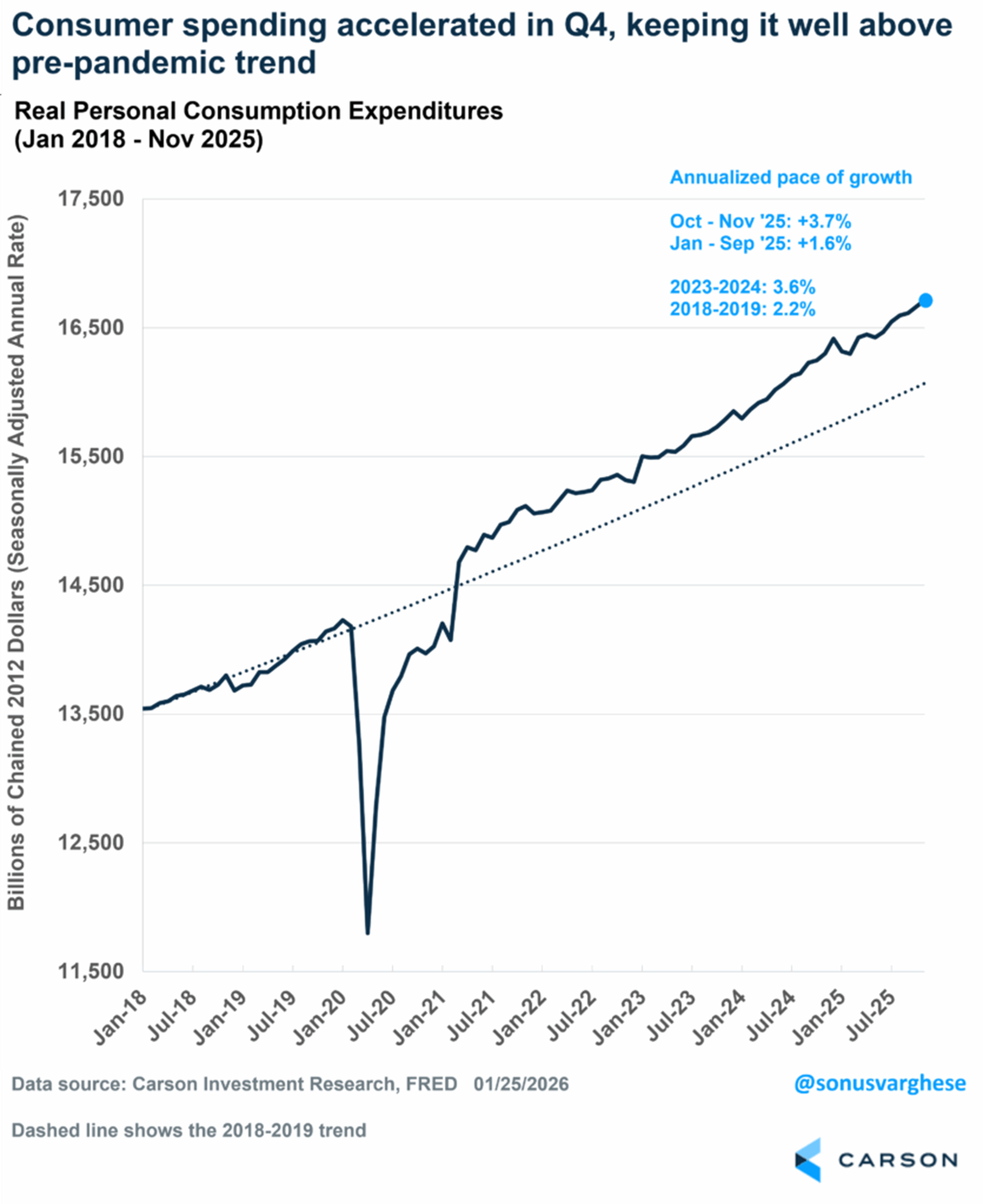 The Fed notably had a much more positive outlook for the economy, a marked shift from six weeks ago. That’s because recent consumer spending data has been solid. Inflation-adjusted “real” personal consumption rose at an annualized pace of 3.7% over the most recent two months for which we have data (October and November).