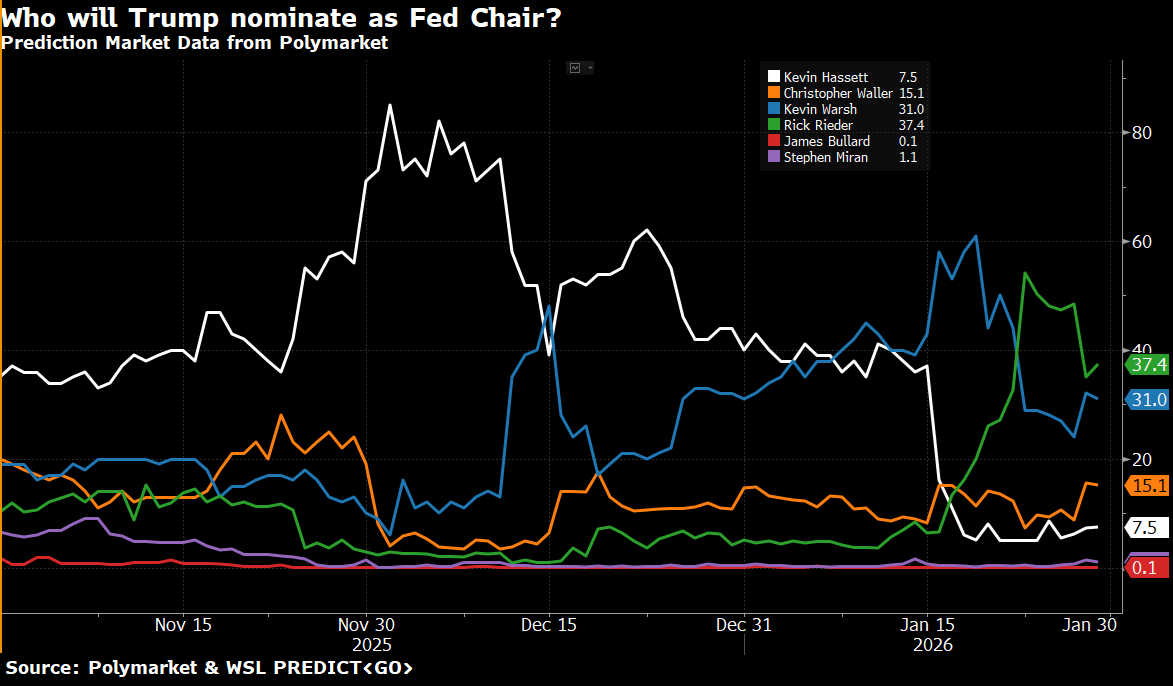 Waller’s chances in prediction markets rose after the dissent, from under 10% to 15%. This came mostly at the expense of this week’s “most talked about” candidate, Rick Rieder, BlackRock CIO of global fixed income, whose odds fell from 48% to 37%. The prior week’s favorite, Kevin Warsh, saw odds improve from 24% to 31%, though he was at 61% two weeks ago. Meanwhile, the odds-on favorite from a month ago, Kevin Hassett (current head of the National Economic Council in the White House), is at just 8%.