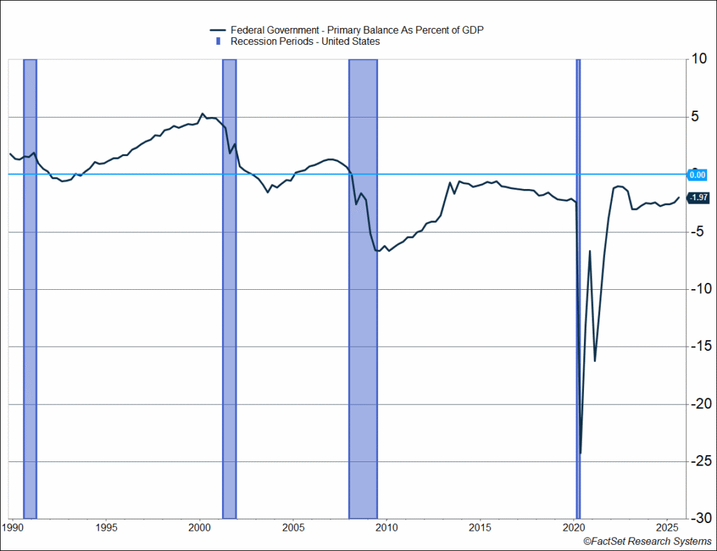 An added factor in the low inflation of the late 90s was the federal government running a primary surplus from 1995 onwards. The primary balance is the fiscal balance excluding interest payments, and it’s a good way to get a sense of actual fiscal outlays that are passed by DC lawmakers relative to revenue. As you can see below, the primary balance moved into surplus in 1994 and was running around 3-5% of GDP in the late 1990s. That kept a tight lid on inflation.
