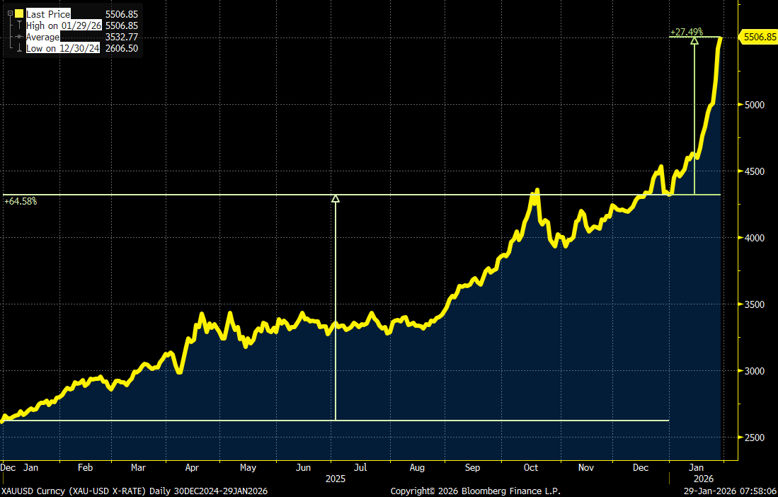 The debasement trade is essentially why gold is surging. In fact, it’s risen 28% year to date, and that’s on the back of a 65% gain in 2025.