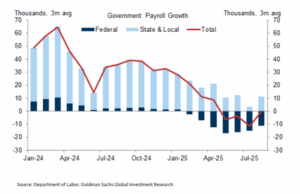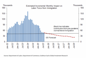 Net immigration is now running around 0.5 million/year, a big slowdown from the last two years. At its peak in 2023, it was three million. As a result, the contribution to monthly labor force growth from immigration has fallen from 90,000 at the start of the year to 40,000 in August. Goldman expects it to fall even further in the months ahead. (This isn’t an assessment of the policy decisions that have led to that decline, just the impact on job growth.)
