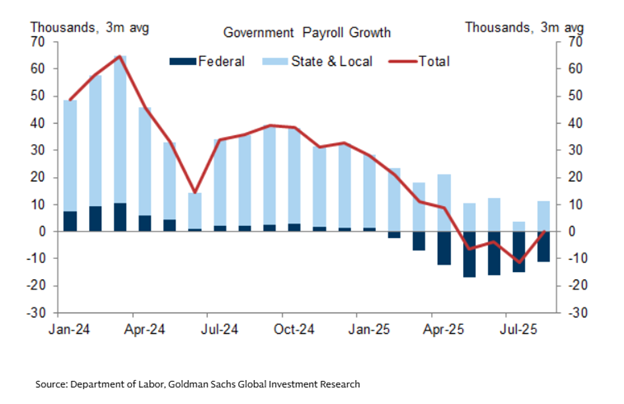 But to close where we started, is the impact from these factors just temporary? Uncertainty, as we’ve seen, has already proved temporary. The AI impact we’ll leave as a known unknown, but for now if you include job growth from the AI infrastructure buildout you can argue that it’s actually been a net contributor given low job loss from AI replacement. With government jobs, it depends on whether we see further cuts (including funding cuts), including what’s happened during the shutdown. The effect might not be over yet but it’s winding down. And uncertainty around tariffs has stabilized.