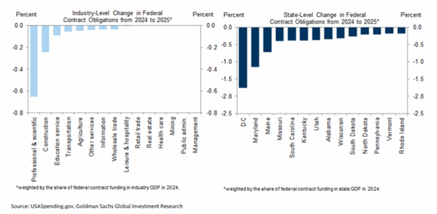 In fact, private payroll growth has also been selectively hit due to a drop in government funding. There’s been a sharp pullback in private payroll growth in professional and scientific services, construction, and private education services industries, and in Washington DC and Maryland (where many federal workers live) since the start of the year.