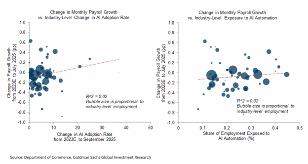 There is an active debate around whether AI is currently destroying jobs (and an even more active debate around what the future holds). The analysis from Goldman suggests not. They tested whether a higher AI adoption rate or a larger share of workers specializing in tasks that are more susceptible to automation by AI technology within an industry is associated with a more significant decline in job growth. And the tests don’t really show much correlation.