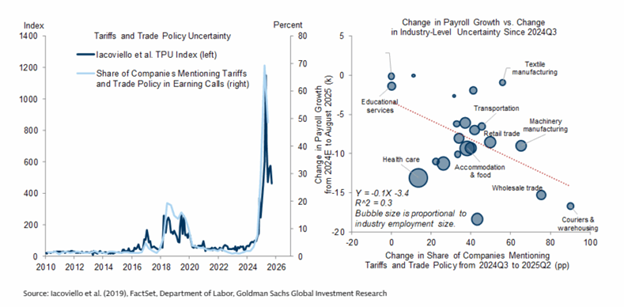 I’ve been skeptical that tariffs have directly resulted in job losses (mostly because we’re nowhere near the worst case scenario, or even the pre-Liberation Day base case scenario for tariffs). Still, Fed surveys point to companies saying they are reducing hiring as one of several cost-saving strategies to cope with tariff costs. But the direct impact of higher tariffs on hiring appears limited. The 30 goods-producing industries most negatively affected have reduced job growth only slightly this year. Goldman finds larger increases in tariff uncertainty since last year have been associated with declines in job growth across affected industries. Though again, this doesn’t have a huge aggregate impact, like say, the decline in immigration. Even in the right panel below you can see change in healthcare payroll growth declining relatively more than other industries, and that’s not directly a result of trade uncertainty. (Federal contract funding may play a role.)