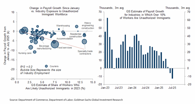 Corroborating this is the fact that industries that rely on undocumented immigrant workers have seen larger declines in job growth since the start of the year. Goldman estimates that employment growth in industries where unauthorized immigrants account for over 10% of the workforce has fallen from ~20,000/month in January to a decline of -10,000/month in July.