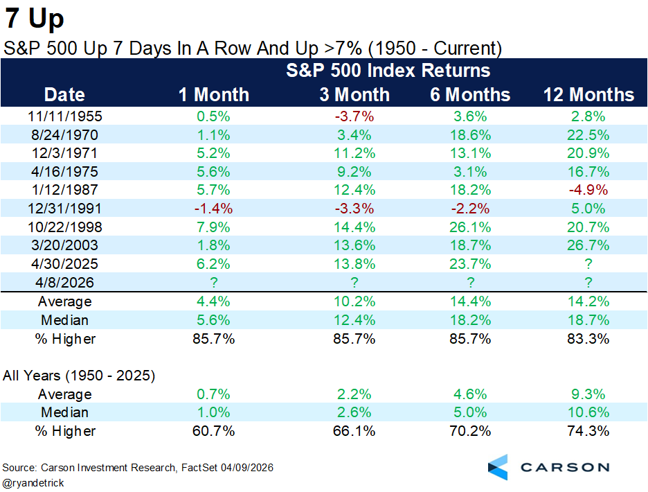 The future returns have been extremely strong across the board when we’ve seen seven-day win streaks up more than 7%, but what really stands out to me is the average 10% gain just three months later. Going back 30 years, we’ve seen this happen only three other times and a gain of nearly 19% six months later was the worst follow-up out of the three. Not bad.