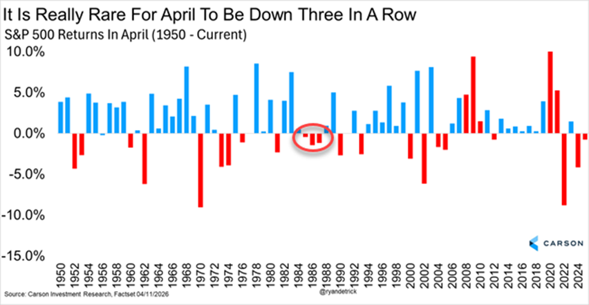 No, we don’t think you should ever blindly invest in seasonality, but it is worth noting that stocks were lower in April each of the past two years and only once in history (the mid-1980s) did it fall three years in a row. April is off to a roaring start, but there is clearly still more time.