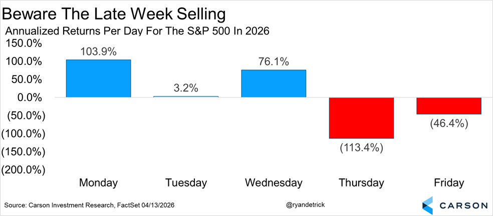 Incredibly, the last time both Thursday and Friday were higher during the same week was the third week of January, nearly three months ago! Here’s a nice breakdown of how each day of the week has done this year on an annualized basis. Should we start to see some late week confidence (which we haven’t seen yet), that would be another reason to think the worst could be behind us.
