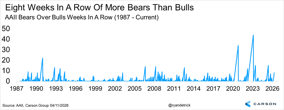 Lastly, the American Association of Individual Investors (AAII) Sentiment Poll has seen more bears than bulls for eight weeks in a row. I looked into this and found 19 other times the bears outnumbered the bulls for this long and the majority of those time stocks were down well over double digits or in outright bear markets. Well, this time the S&P 500 was only about three percent from all-time highs and you have to go back to 1993 for the last time we saw a streak of bearish sentiment like this and stocks closer to new highs.