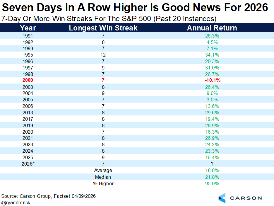 Building on the recent seven-day win streak, years that have one have been higher 19 of the past 20 time (only 2000 was lower) with an average annual gain of 18.8%, another clue 2026 might not be that bad when all is said and done.