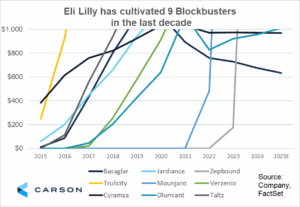 The realized revenues and projected growth from this portfolio of AOMs is expected to make this line of medicines “the bestselling medicine in history” according to a recent Wall Street Journal article.1 Positive trial readouts and robust revenue growth from these AOMs have catalyzed the most recent run in Lilly’s stock price.